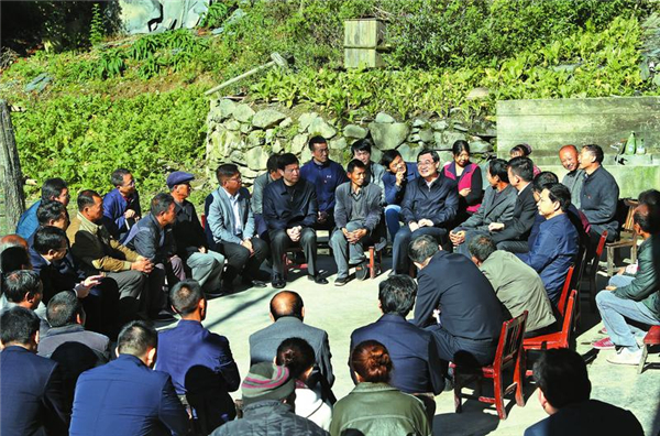? (10月10日,省委書記胡和平深入嵐皋縣南宮山鎮(zhèn)西河村,與部分群眾及鎮(zhèn)村干部進(jìn)行座談,了解扶貧工作進(jìn)展,聽取群眾意見建議,與大家一起商討脫貧致富的措施。陜西日報(bào)記者 宋紅梅/攝)?
