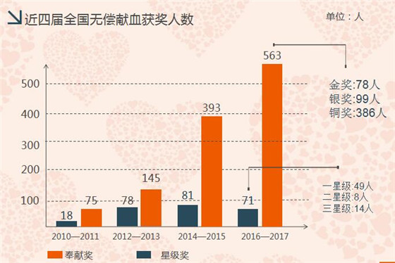 2016至2017年度安康申報(bào)全國(guó)獲獎(jiǎng)人數(shù)634人次,其中:無償獻(xiàn)血奉獻(xiàn)獎(jiǎng)計(jì)563人,金獎(jiǎng)78人,銀獎(jiǎng)99人,銅獎(jiǎng)386人 ;全國(guó)星級(jí)志愿服務(wù)獎(jiǎng)71人,一星級(jí)49人,二星級(jí)8人,三星級(jí)14人。連續(xù)五屆十年榮獲全國(guó)無償獻(xiàn)血先進(jìn)城市;安康職業(yè)技術(shù)學(xué)院被評(píng)為全國(guó)無償獻(xiàn)血促進(jìn)獎(jiǎng)單位;我站站長(zhǎng)胡章學(xué)被評(píng)為全國(guó)無償獻(xiàn)血促進(jìn)獎(jiǎng)個(gè)人。獲獎(jiǎng)人數(shù)創(chuàng)歷史新高。
