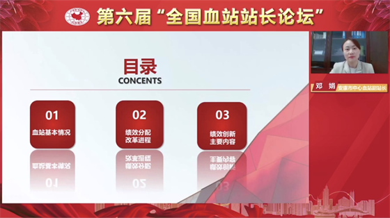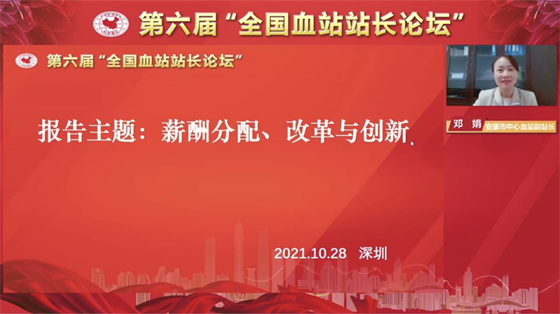 為加強(qiáng)全國血站的經(jīng)驗(yàn)交流與合作,2021年10月27日至28日,第六屆 “全國血站站長論壇”在深圳市舉辦。中國輸血協(xié)會(huì)理事長、世界衛(wèi)生組織輸血合作中心主任朱永明,深圳市衛(wèi)健委二級(jí)巡視員林漢城等相關(guān)領(lǐng)導(dǎo)出席并致辭。此次論壇的主題是“血站建設(shè)與發(fā)展、改革與創(chuàng)新”,來自全國各省、市血液中心(血站)的同仁通過線上方式參加會(huì)議。安康市中心血站副站長鄧娟作為全國血站六個(gè)優(yōu)秀論文交流發(fā)言人之一,就安康血站績效分配、改革與創(chuàng)新工作在會(huì)上進(jìn)行了經(jīng)驗(yàn)交流。