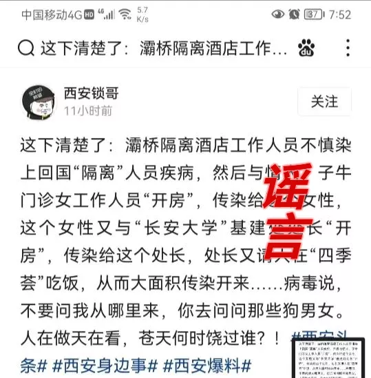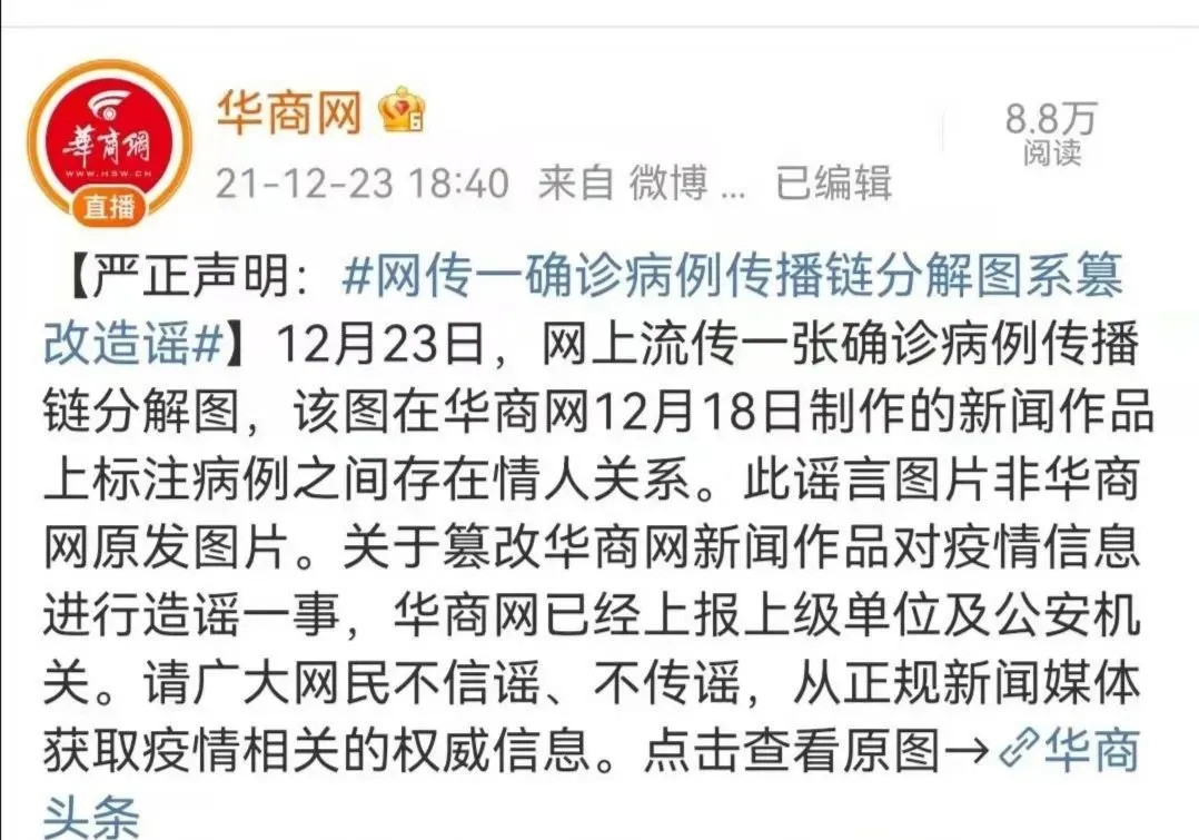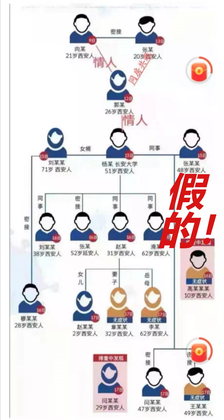 網(wǎng)上流傳一張確認(rèn)病例傳播鏈分解圖,在病例之間標(biāo)注“情人”關(guān)系,并傳言此次疫情傳播因素之一,是因為西安首例病例與子牛門診的護士為情人關(guān)系,導(dǎo)致疫情擴散,經(jīng)核實,該圖盜用華商網(wǎng)12月18日制作的新聞作品圖片。該信息為虛假信息,造謠的人已被拘留。