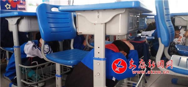 演練分為室內(nèi)緊急避險和應(yīng)急疏散兩個環(huán)節(jié)。上午9時許,隨著第一次地震防空警報聲急促響起,各班班主任立刻指導(dǎo)學生室內(nèi)防震技能,指揮學生迅速躲在各自課桌的旁邊,閉眼,蹲下身體擋住頭部。1分鐘后,再一次發(fā)出地震防空警報聲,在老師的引導(dǎo)下,各班有序秩地撤離,撤離全程不到三分鐘。
