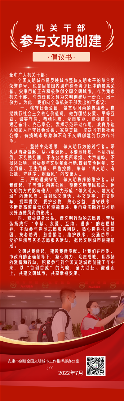 全國(guó)文明城市是反映城市整體文明水平的綜合類榮譽(yù)稱號(hào),也是目前國(guó)內(nèi)城市綜合類評(píng)比中的最高榮譽(yù)。安康目前正在積極爭(zhēng)創(chuàng)全國(guó)文明城市,作為我市機(jī)關(guān)干部,有責(zé)任和義務(wù)為文明創(chuàng)建盡一份心、出一份力。為此,我們向全體機(jī)關(guān)干部發(fā)出如下倡議: