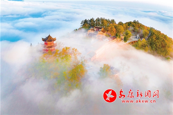 天柱山最美不過秋色,也是我在四季當(dāng)中頻繁上山的季節(jié)。每逢秋天,這里紅黃綠相間,漫山掛彩,在藍(lán)天的映襯下,多了幾分浪漫。從國道211起點的兩條上山公路,由數(shù)個“之”字連接起來,從湖邊一直盤旋至山頂?shù)陌自乒潘拢h(yuǎn)眺仿佛一個大大的“人”字形飄帶。雨后放晴的頭兩個早晨,在云霧的籠罩下,天柱山的下半身連同湖面一并被巨大的“蠶絲被”覆蓋,山的上半身或山頭浮在云海之上,像是茫茫大海上的一座孤島。