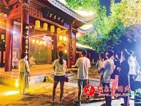 還未走近安瀾樓,就被一首琵琶曲改編的絲竹樂曲《春江花月夜》吸引,流暢多變的節(jié)奏,巧妙細膩的配器,絲絲入扣的演奏,仿佛將觀眾帶入那個月夜春江的迷人景色。環(huán)繞安瀾樓四周,畫家楊炳昌筆下的金州八景,仿佛一秒穿越古今,勝景徐徐、浮現(xiàn)腦際。