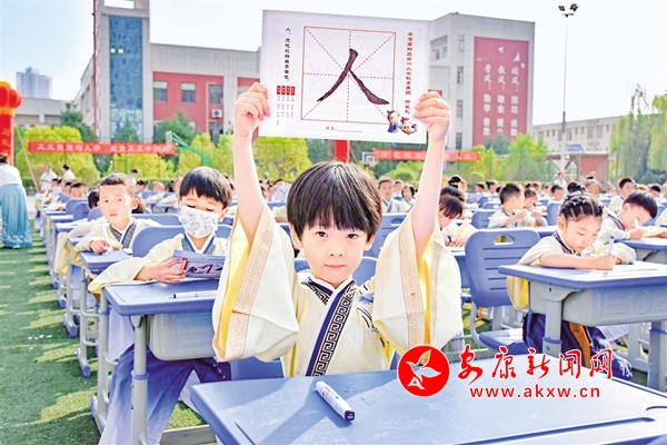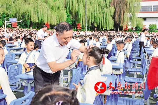 為傳承中國(guó)傳統(tǒng)文化,進(jìn)一步加強(qiáng)學(xué)生文明禮儀教育,日前,安康高新區(qū)第一小學(xué)舉行一年級(jí)新生開筆禮及優(yōu)秀學(xué)生表彰活動(dòng)。千名一年級(jí)蒙童身著漢服,由班主任帶領(lǐng)跨過啟蒙門,正衣冠、感恩鞠躬、朱砂啟智、擊鼓明志、開筆啟蒙,接受中國(guó)傳統(tǒng)文化的洗禮,領(lǐng)略傳統(tǒng)文化的魅力。(張凌云 攝)