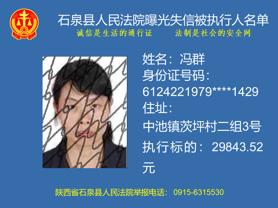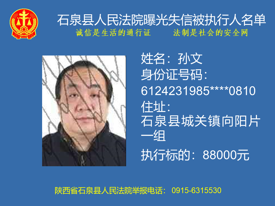 為了進(jìn)一步加大執(zhí)行力度,保障勝訴當(dāng)事人的合法權(quán)益,推進(jìn)社會(huì)誠信體系建設(shè),依照《中華人民共和國民事訴訟法》、《最高人民法院關(guān)于公布失信被執(zhí)行人名單信息的若干規(guī)定》等法律、司法解釋的有關(guān)規(guī)定,現(xiàn)對一批已進(jìn)入執(zhí)行程序,且尚未全部履行義務(wù)的被執(zhí)行人進(jìn)行媒體曝光,歡迎廣大群眾支持石泉縣人民法院的工作,向我院提供被執(zhí)行人的財(cái)產(chǎn)線索,使生效法律文書能夠得到切實(shí)執(zhí)行,讓人民群眾切實(shí)感受到公平正義就在身邊。