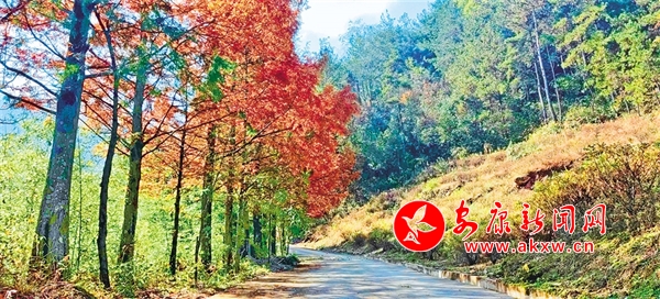 車子沿著山路繼續(xù)往上,途中時不時掠過一排排水杉,水杉的顏色有綠有黃、有深有淺,高大挺拔、直入云端。偶爾有幾棵同類型品種夾雜其中,已全然呈現(xiàn)出上下一體的棕黃色。在太陽的照射下,仿佛是身披金黃鎧甲的戰(zhàn)士,堅韌有力。枝葉在微風(fēng)中輕搖,沙沙地響,視聽一體的感覺,不覺教人沉醉其中。