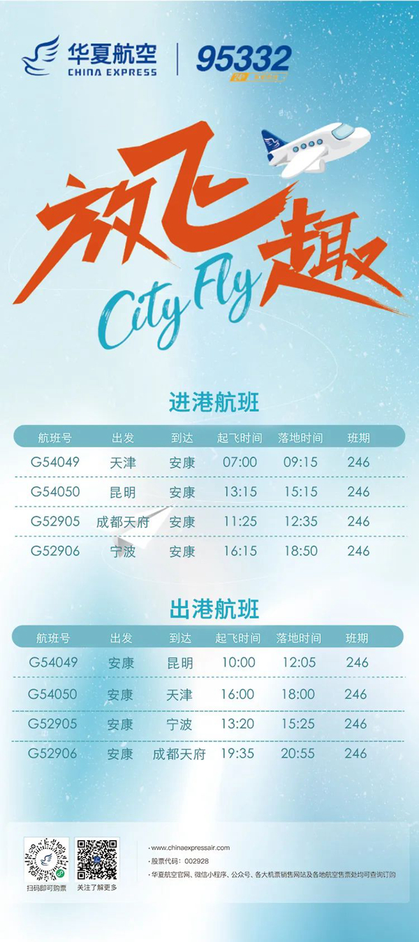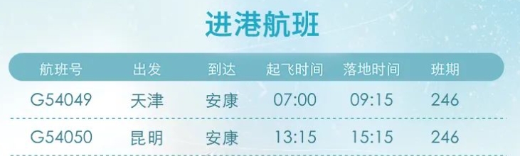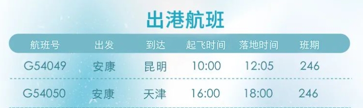 12月26日起,安康富強機(jī)場新增“安康=昆明”“安康=天津”航線。具體航線航班如圖: