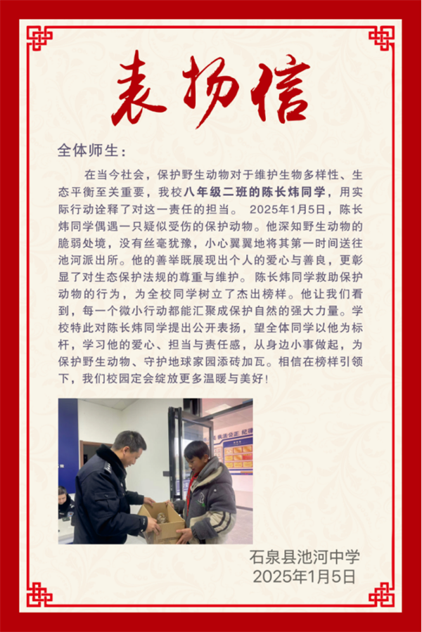 陳長煒的暖心事跡傳到學(xué)校后,學(xué)校發(fā)布了表揚信,公開表揚陳長煒同學(xué)的愛心善舉和保護野生動物的暖心行為。號召全體學(xué)生要學(xué)習(xí)陳長煒的愛心、責(zé)任和擔(dān)當,從小事做起,從自身做起,保護野生動植物,為保護地球家園、尊重生態(tài)文明的多樣性貢獻力量。?