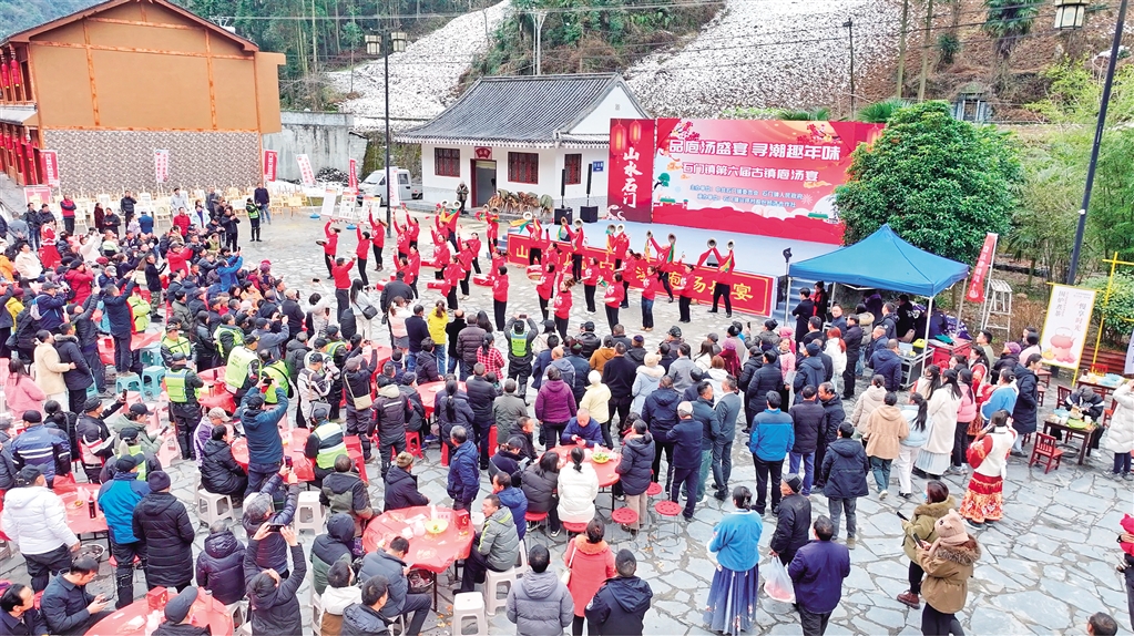 據(jù)了解,為了準備此次庖湯宴,去年12月底,石門鎮(zhèn)總投資120余萬元開始進行橫溪古鎮(zhèn)舊房改造提升項目,著力打造“古鎮(zhèn)庖湯宴”品牌。經(jīng)過項目改造,古鎮(zhèn)完成全面升級。不僅如此,石門鎮(zhèn)政府還不斷通過“線上+線下”的宣傳方式,提升當(dāng)?shù)芈糜螛I(yè)影響力,積極制作旅游宣傳視頻,此次活動帶動引流2000人次。(柯明宇 攝)