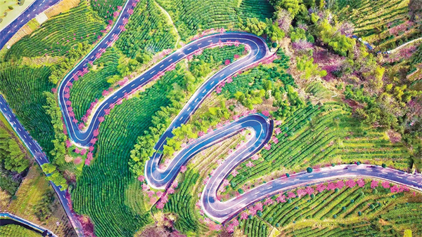 沿著茶山步道拾級而上,茶農采青的竹簍與游人拍照的紗巾在梯田間次第閃現(xiàn)。粉白相間的梅花如云絮般綴滿枝頭,風過處,花瓣簌簌落入茶叢,為嫩綠的新芽染上淡淡馨香。遠處黛瓦白墻的徽派民居與近處起伏的茶壟構成天然畫框,無人機視角下,蜿蜒的茶道如同玉帶纏繞山腰,將紅楓、櫻花、梅林串成斑斕的珠鏈。