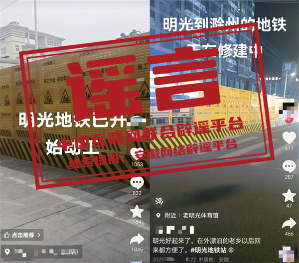 真相:近日,網(wǎng)民“張**”“沙**”等發(fā)布視頻,編造并傳播“明光地鐵已開始動工”相關(guān)虛假信息,并配以誤導(dǎo)性視頻,引發(fā)關(guān)注和討論。經(jīng)核實(shí),相關(guān)視頻內(nèi)容對應(yīng)區(qū)域施工項(xiàng)目并非修建地鐵,網(wǎng)傳視頻系謠言。明光市委網(wǎng)信辦和市公安局已依法對張某、沙某等進(jìn)行批評教育,并要求其刪除相關(guān)不實(shí)信息。(來源:“安徽省互聯(lián)網(wǎng)違法和不良信息舉報(bào)”微信公眾號、明光市委網(wǎng)信辦)