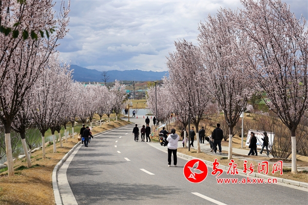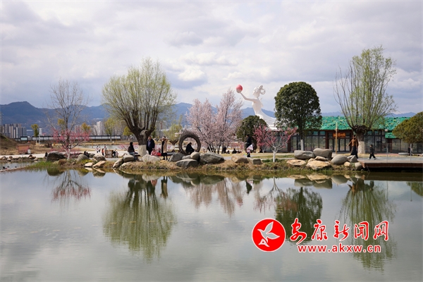 景區(qū)紫葉李、桃花競(jìng)相綻放,吸引市民前往觀(guān)賞。