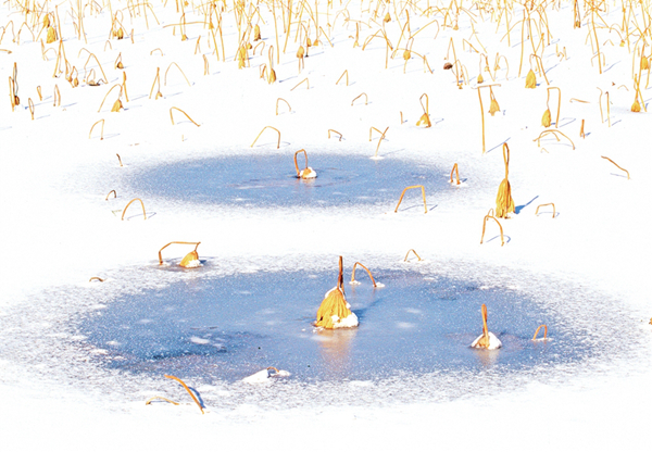 我的攝影創(chuàng)作圍繞生命的痕跡、時間的隱喻兩個主題。在《嘉實擷芳·野圃瑤音》中,菜園的微觀生態(tài)被賦予交響樂般的節(jié)奏——葫蘆藤的螺旋曲線是生命的律動,西紅柿根莖的垂直排列是生長的秩序,蚜蟲蝕痕的細(xì)節(jié)則暗喻生態(tài)的共生與抗?fàn)帯6凇冻武翳啊ど吃滤莨狻防?,榮成海岸的冬夏對比成為時間的隱喻,結(jié)冰湖面上的凋敗蓮蓬是流逝凝固的時光,夏日海邊的金色水洼則是流動的永恒。我癡迷于捕捉這種矛盾與共生——就像用冷暖色調(diào)碰撞出畫面的張力,也用虛實構(gòu)圖處理每一張照片,期待每一張照片是個性鮮明,讓人耳目一新。