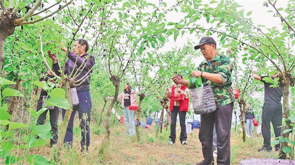劉術(shù)榮的桑樹枝繁葉茂,桑葚掛滿枝頭,吸引了市民和游客觀光采摘。他每天請了十幾名工人幫忙,抓緊時間采收桑葚。經(jīng)過科學(xué)管護(hù),這片果桑園每年能產(chǎn)桑葚超過20噸,帶動30余戶村民實(shí)現(xiàn)穩(wěn)定增收。