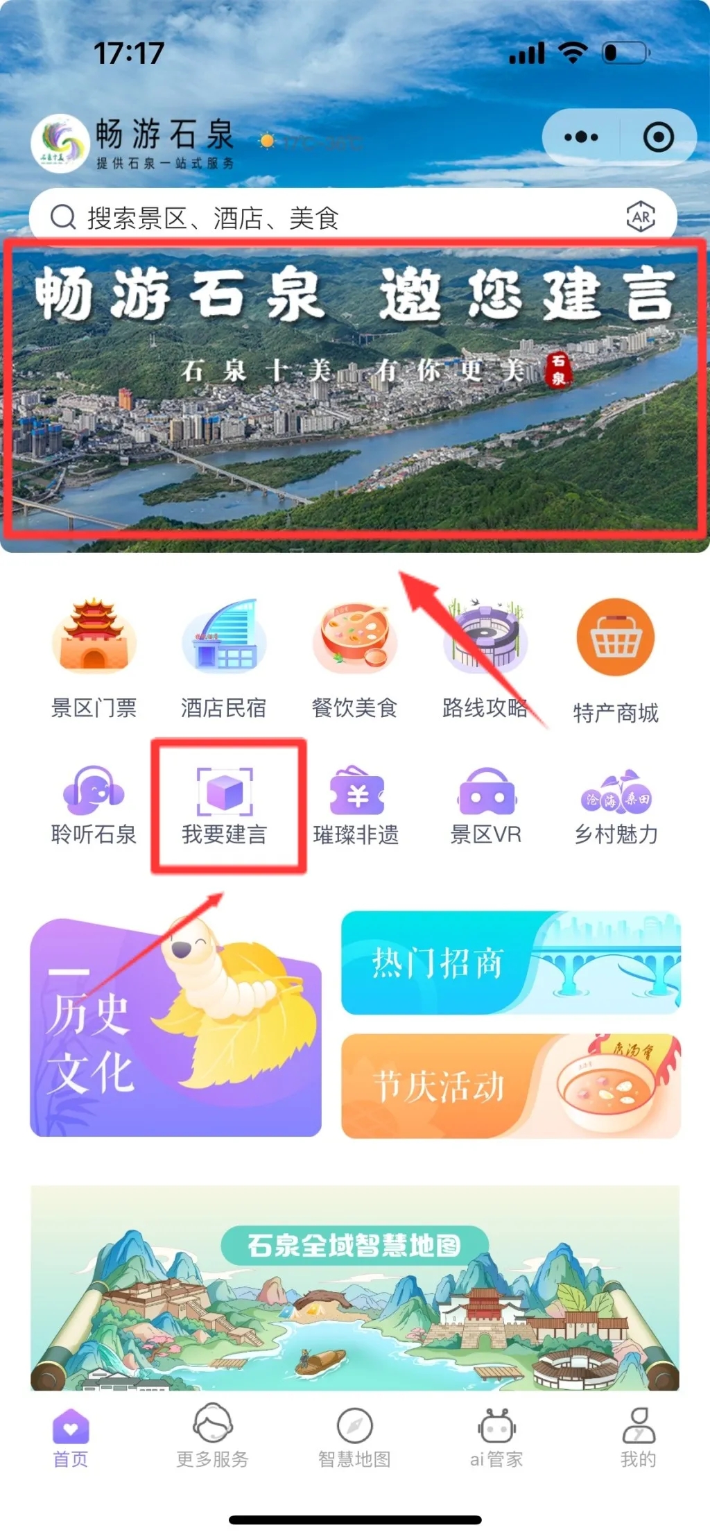 1.官方賬號(hào):打開(kāi)“暢游石泉”小程序,點(diǎn)擊“暢游石泉 邀您建言”意見(jiàn)建議征集頁(yè)面,提交建議。