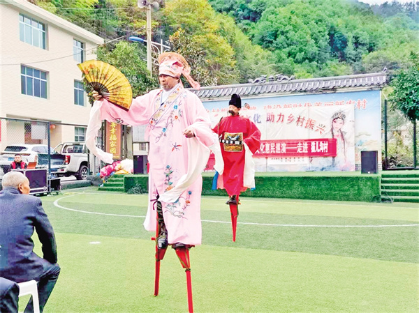 在五峰村,村支部書記羅仁春告訴記者,2023年村委會牽頭成立了五峰村文化民俗文藝協(xié)會,陸續(xù)加入的48名會員涵蓋老中青三代,既有傳承高蹺絕技的老人,也有主動學習弦子腔的年青一代。今年32歲的村民小梅加入協(xié)會后,一改往日下班后悶在家中的狀態(tài),每天下午吃完飯都會下樓和新認識的姐妹載歌載舞,很快就成為舞蹈隊的主力?!耙郧安恢牢覀兇迳线€有文藝協(xié)會,自從村上干部告訴我后,我就趕緊加入了這個小團體,既鍛煉了身體,又愉悅了心情,生活幸福感越來越強烈?!鄙碇璧阜男∶飞碜随鼓?,水袖飛揚間,明媚的笑容如花一樣燦爛。