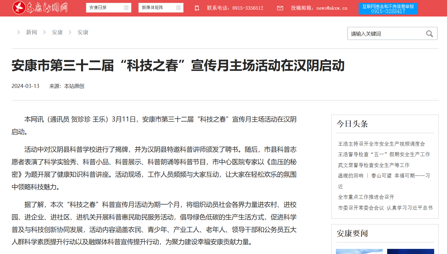 黨的二十大報(bào)告指出,培育創(chuàng)新文化,弘揚(yáng)科學(xué)家精神,涵養(yǎng)優(yōu)良學(xué)風(fēng),營造創(chuàng)新氛圍。為推動(dòng)全民科學(xué)素質(zhì)全面提升,鼓勵(lì)全社會(huì)關(guān)注科學(xué)創(chuàng)新,形成崇尚科學(xué)的良好氛圍,安康新聞網(wǎng)通過“全國科普日集中宣傳”等主題宣傳,持續(xù)發(fā)布一系列民生科普報(bào)道,切實(shí)增強(qiáng)科學(xué)知識(shí)在群眾中的普及率,取到了良好的社會(huì)效果。