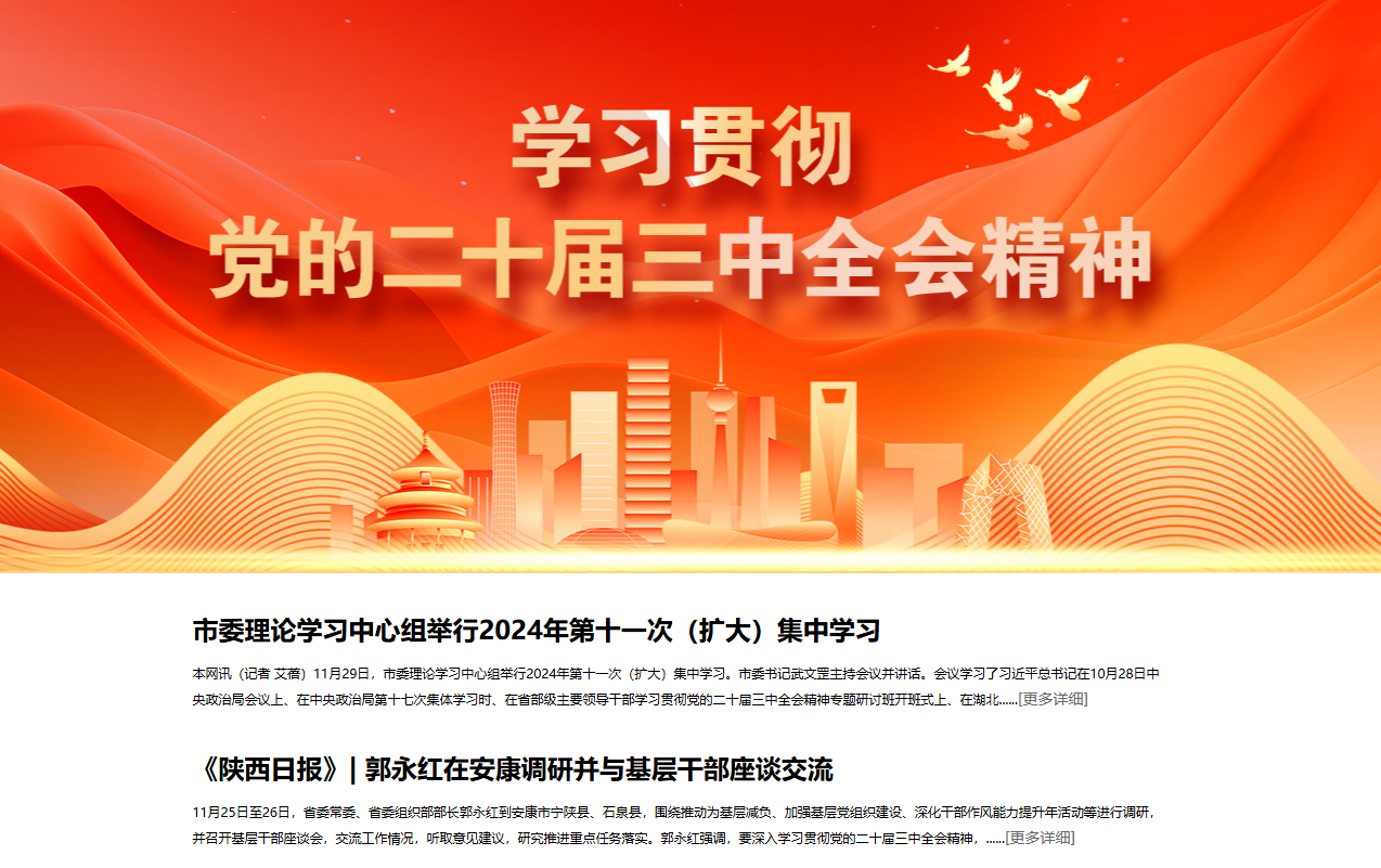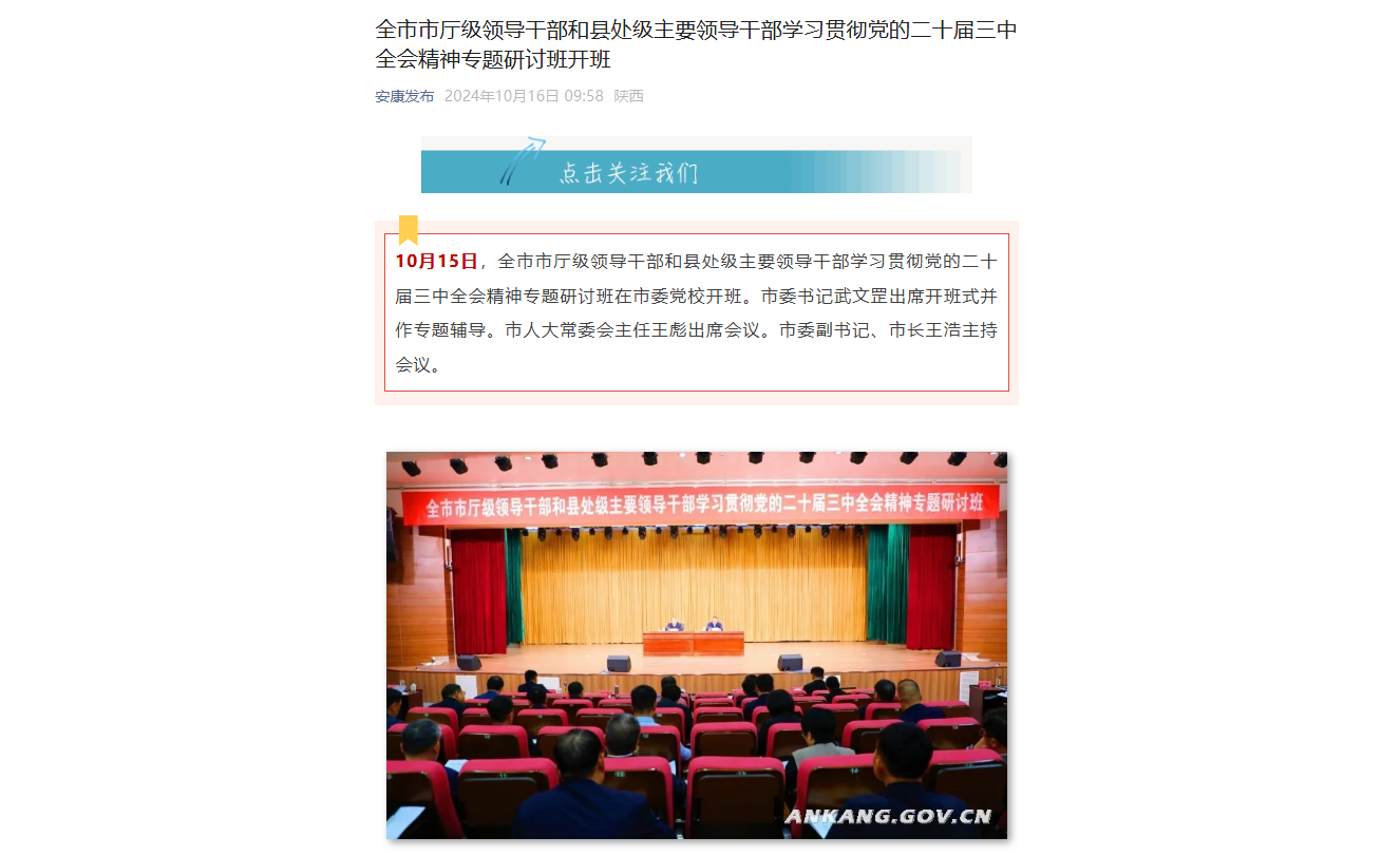 《全市市廳級領(lǐng)導(dǎo)干部和縣處級主要領(lǐng)導(dǎo)干部學(xué)習(xí)貫徹黨的二十屆三中全會(huì)精神專題研討班開班》(2024-10-16發(fā)布于安康發(fā)布公眾號(hào))