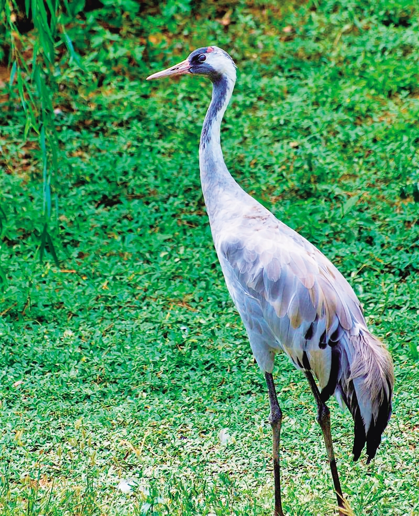 別名千歲鶴、玄鶴、番薯鶴、普通鶴、元鶴。通體羽色幾乎全為灰色;前額和眼先黑色,頭頂裸區(qū)部分呈朱紅色,喉、前頸和后頸灰黑色;自眼后有一道寬的白色條紋伸至頸背;眼虹膜紅褐色或深紅色;嘴暗綠色,先端顏色略淡;脛、跗跖及趾均為灰黑色。(來(lái)源:安康市林學(xué)會(huì))