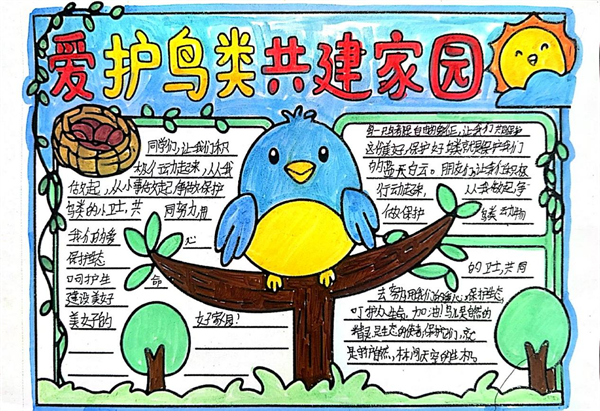 守護藍天精靈,共享美好家園!《安康高新區(qū)愛鳥護鳥倡議書》發(fā)布以來,全區(qū)的孩子們積極行動,他們用畫筆以純真之心勾勒出對鳥兒的關(guān)愛與守護。他們把對鳥兒的喜愛融進顏料,將守護的心愿畫入畫紙。稚嫩的筆觸下,有給小鳥搭建的溫暖巢穴,有禁止捕鳥的醒目標語,有鳥兒在藍天自由翱翔的愜意,有人類與鳥兒和諧共處的溫馨,有孩子們與鳥兒牽手同行的幻想…… (通訊員 劉松)