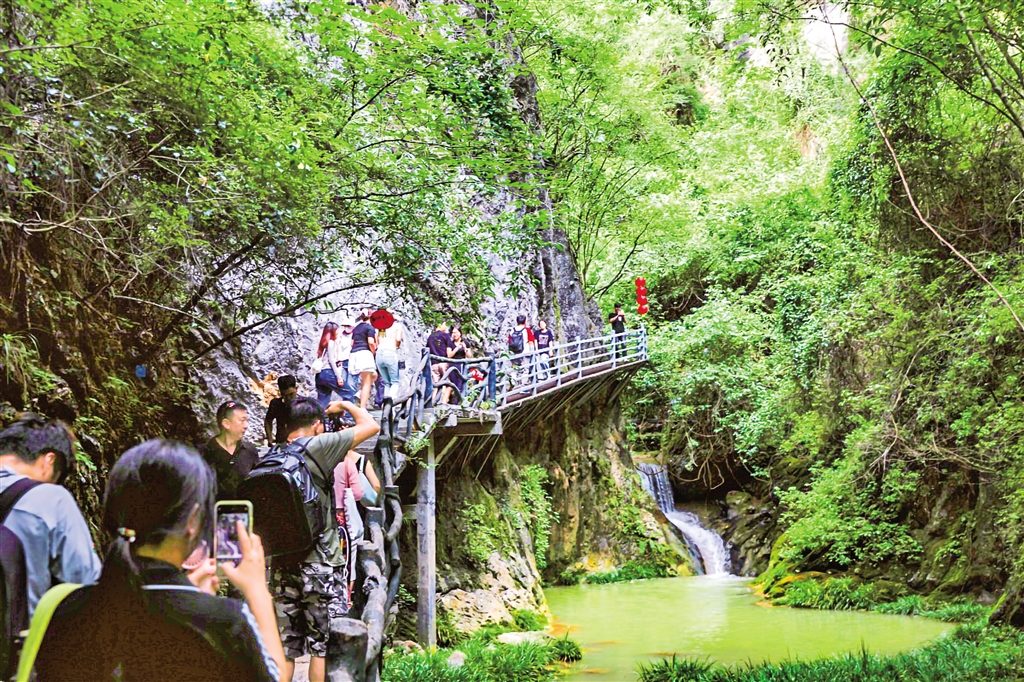 游客在雁山瀑布景區(qū)感受夏日清涼