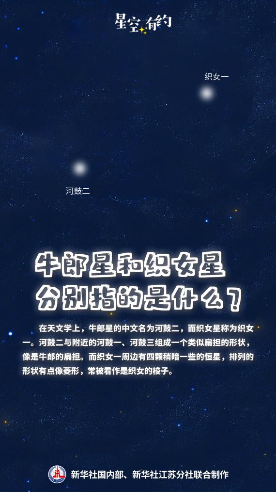 中國(guó)科學(xué)院紫金山天文臺(tái)科普主管王科超說,在天文學(xué)上,代表牛郎、織女的天體分別是牛郎星和織女星。牛郎星的中文名為河鼓二,織女星為織女一,它們分別是天鷹座和天琴座的亮星。河鼓二與附近的河鼓一、河鼓三組成一個(gè)類似扁擔(dān)的形狀,像是牛郎的扁擔(dān)。而織女一周邊有四顆稍暗一些的恒星,排列的形狀有點(diǎn)像菱形,常被看作是織女的梭子。