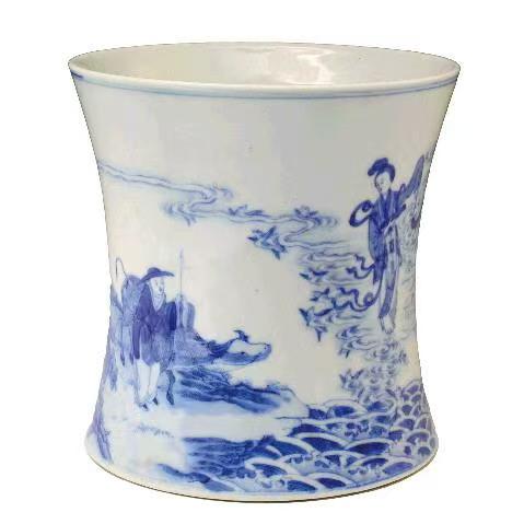 山東博物館收藏的清光緒青花七夕卷筒,也描繪了牛郎織女在天河上即將相會的情景。卷筒圖案中,祥云繚繞、喜鵲飛舞,鵲橋很快就會搭成。一年未見,牛郎拱手準備,對即將到來的見面迫不及待;織女衣袂飄飄,含情脈脈地望著日夜思念的牛郎。畫中人物清麗灑脫、典雅高貴,器物主題鮮明、藝術性較高,真可謂秦觀筆下“金風玉露一相逢,便勝卻人間無數(shù)”的生動注解。