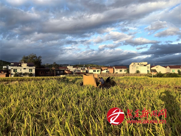 走進(jìn)新河村,陽(yáng)光灑在沉甸甸的稻穗上,飽滿(mǎn)的谷粒泛著金黃光澤。微風(fēng)拂過(guò),連片稻田掀起層層稻浪,裹挾著清新的谷物香氣彌漫田間。稻田里,農(nóng)機(jī)手熟練地操控著收割機(jī),在田間來(lái)回穿梭,機(jī)身所過(guò)之處,水稻快速完成脫粒、秸稈分離,金黃的稻谷源源不斷送入機(jī)倉(cāng),實(shí)現(xiàn)顆粒歸倉(cāng);為進(jìn)一步加快水稻收割進(jìn)度,幾位村民則支起拌桶,手持稻把用力拍打,沿用傳統(tǒng)打谷技藝同步搶收,機(jī)器轟鳴聲、打谷聲與村民的歡聲笑語(yǔ)交織成秋日豐收的“協(xié)奏曲”。