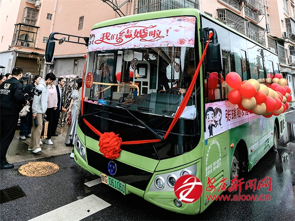 為了讓公交車(chē)更有“婚禮氛圍”,新郎、新娘和親友們一起用氣球、飾品和貼畫(huà)對(duì)車(chē)廂進(jìn)行了簡(jiǎn)單裝飾,既溫馨又不浮夸。10月4日迎親當(dāng)天,精心裝飾的婚車(chē)準(zhǔn)時(shí)到達(dá)目的地。橫幅海報(bào)“我們結(jié)婚啦”與紅繡球貼在公交車(chē)頭,氣球貼滿(mǎn)車(chē)身,將接親的儀式感“拉滿(mǎn)”。新郎、新娘在眾多親朋好友的陪伴下,一起登上這輛“專(zhuān)車(chē)”,駛向名為“幸?!钡南乱徽尽\?chē)廂內(nèi),互動(dòng)節(jié)目層出不窮,祝福歌聲不斷,一路歡聲笑語(yǔ)。車(chē)窗外,不少市民看到這獨(dú)特的“婚車(chē)”,紛紛拿出手機(jī)拍照,揮手送上祝福。