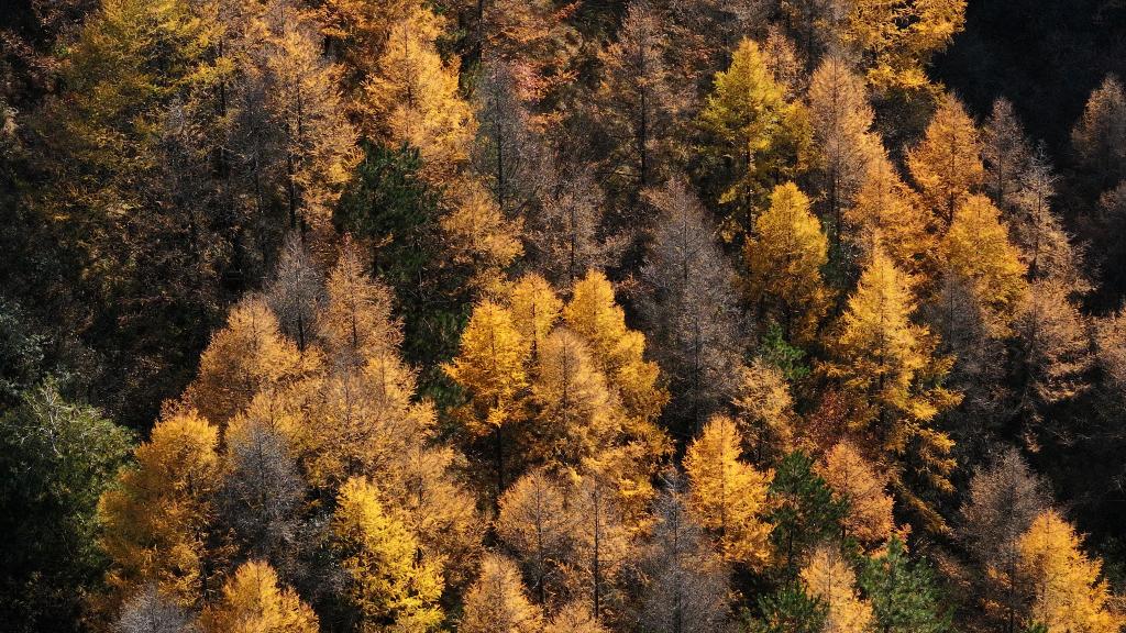 位于六盤山西麓的寧夏固原市西吉縣大寨山林場秋景(無人機(jī)照片)。新華社記者 楊植森 攝