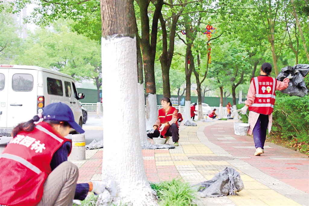 “刷白不是簡單的涂涂畫畫,得兼顧效果與顏值?!爆F(xiàn)場管護負責(zé)人周宏安介紹,作業(yè)中嚴格執(zhí)行統(tǒng)一標準,采用涂白劑、石硫合劑、水按20∶1∶10配比的藥劑,在每棵樹上標定基準線,確保涂白高度控制在1米至1.2米之間,做到上口平齊、下不露“腳”。針對樹皮縫隙、孔洞等關(guān)鍵部位,工人們反復(fù)涂刷,同時全程做好防護,避免藥劑外濺污染路面與樹穴,實現(xiàn)“防護到位、環(huán)境整潔”雙重目標。