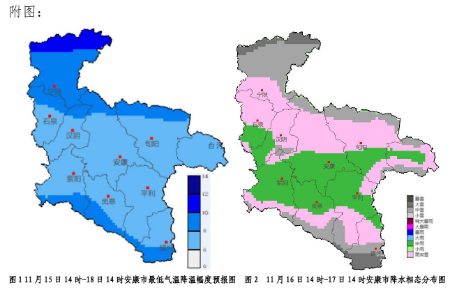 受冷空氣影響,15—17日全市過程日最低氣溫下降8~10℃,最低氣溫將出現在18日和19日清晨,全市大部會出現今冬初霜凍。預計最低氣溫:川道地區(qū)-4~2℃,中高山地區(qū)-8~-4℃,秦巴高山局地低于-8℃。16日夜間至17日白天我市大部有明顯吹風天氣,陣風可達5—6級。