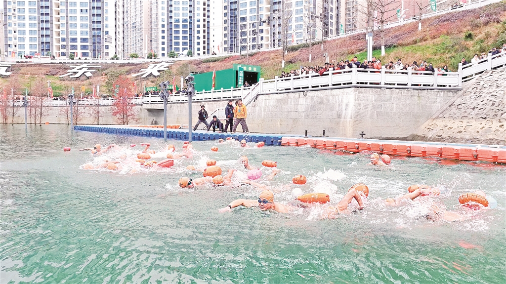 12月21日,陜西省第八屆漢江公開水域冬泳賽在紫陽縣月畔灣廣場(chǎng)水域舉行。當(dāng)天,來自陜西、湖北、四川、重慶、河南、內(nèi)蒙古自治區(qū)的44支代表隊(duì)400余名運(yùn)動(dòng)員報(bào)名參賽。(儲(chǔ)茂銀 攝)