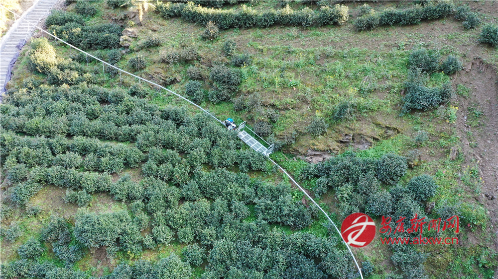 (圖為蘇陜項目支持建設的煥古鎮(zhèn)大連村軌道車上山運輸鮮葉)