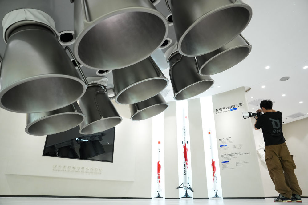 強(qiáng)化產(chǎn)業(yè)圈聯(lián)動發(fā)展,是北京持續(xù)提升科技成果區(qū)域內(nèi)轉(zhuǎn)化效率和比重的有效舉措。以商業(yè)航天產(chǎn)業(yè)為例,目前,扎根北京的商業(yè)航天百強(qiáng)企業(yè)、上市企業(yè)和獨角獸企業(yè)約占全國半壁江山。產(chǎn)業(yè)鏈覆蓋運(yùn)載火箭、衛(wèi)星制造、地面站及終端設(shè)備、衛(wèi)星應(yīng)用服務(wù)全領(lǐng)域。這是2025年6月18日在北京經(jīng)濟(jì)技術(shù)開發(fā)區(qū)藍(lán)箭航天空間科技股份有限公司拍攝的朱雀系列運(yùn)載火箭模型。