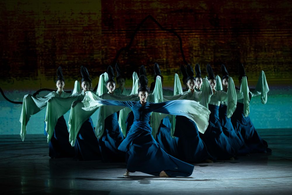 這是舞蹈詩劇《只此青綠》的演出劇照(2024年7月18日攝)?!吨淮饲嗑G》采用平行空間的敘事方式,從故宮博物院青年研究員的“展卷人”視角出發(fā),講述北宋著名畫家王希孟創(chuàng)作《千里江山圖》的故事。該劇連續(xù)3年穩(wěn)居中國舞劇票房榜首,全國巡演超800場,赴多個國家和地區(qū)演出50余場,成為傳統(tǒng)文化創(chuàng)新表達、中國藝術(shù)國際表達的典范之作。