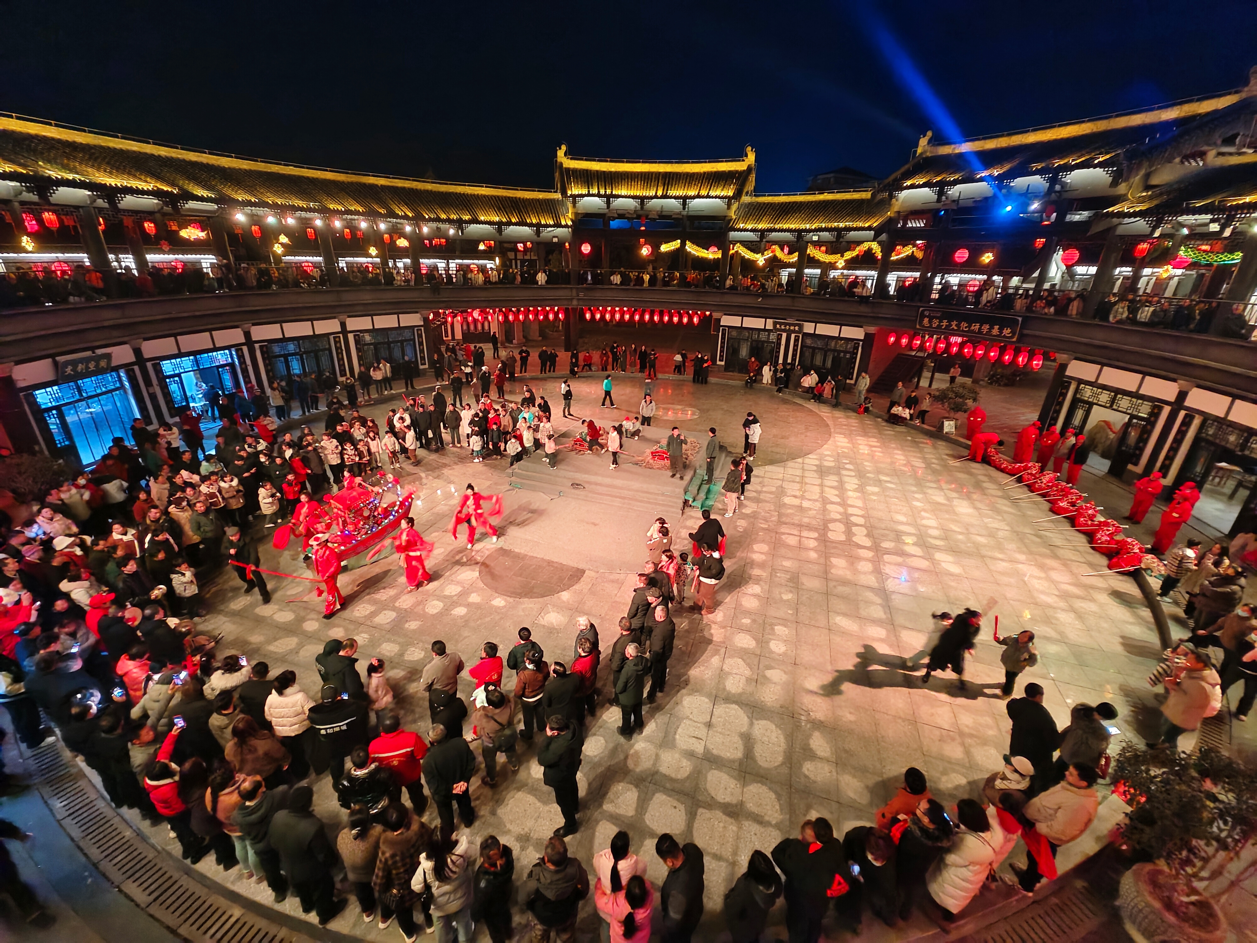 夜幕降臨,石泉縣秦巴風情園智苑圓樓前,游人欣賞石泉民俗表演。 楊勇 攝