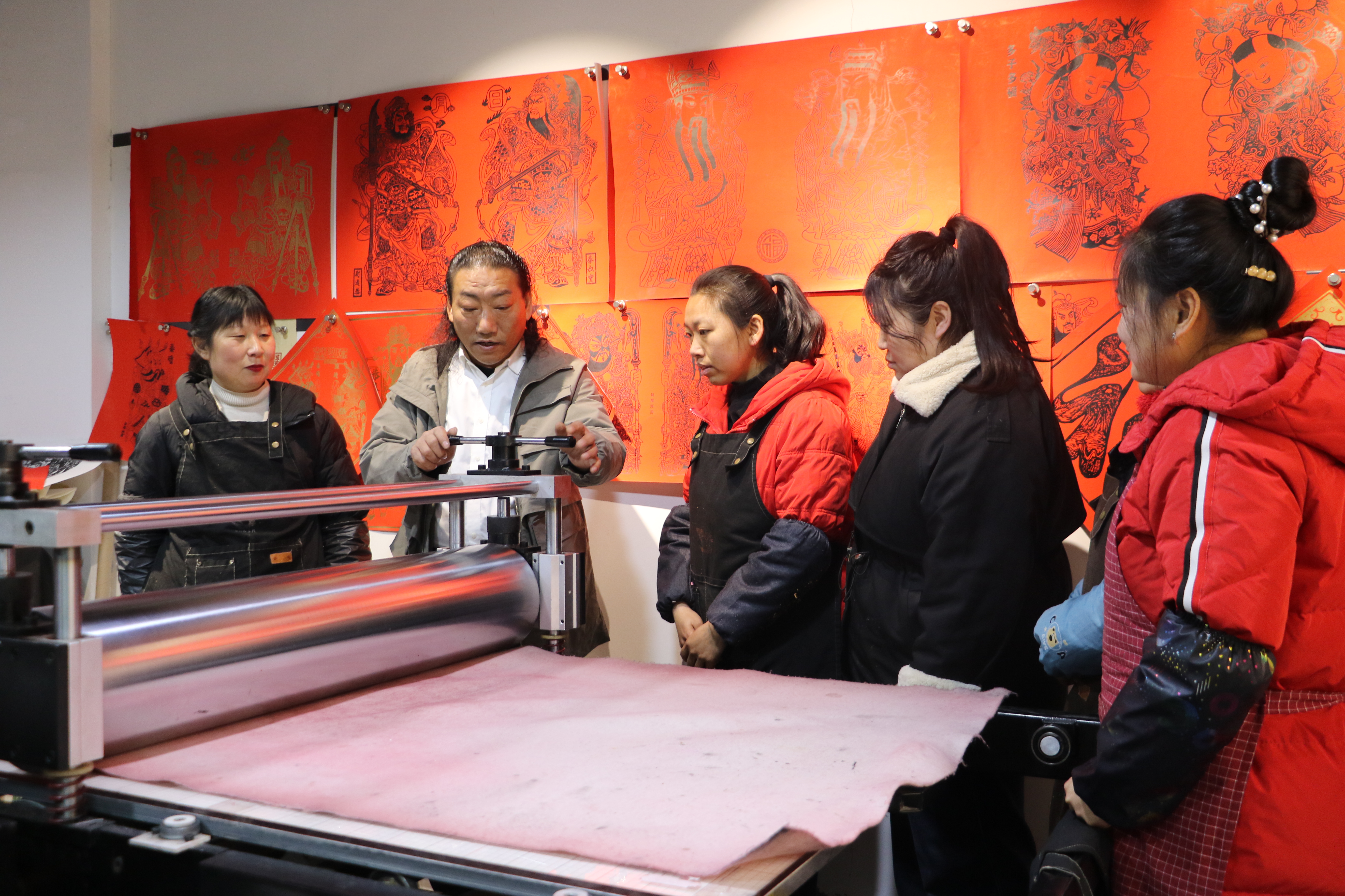 農(nóng)歷馬年春節(jié)前夕,在版畫院,一張張年畫整齊攤晾在貨架上,有明清紋樣的紅底金漆財(cái)神像,也有“馬上”成功的文創(chuàng)系列。雕版、刷色、拓印、攤晾、包裝、發(fā)貨……肖昌雙和姐妹們里里外外忙成一團(tuán)。